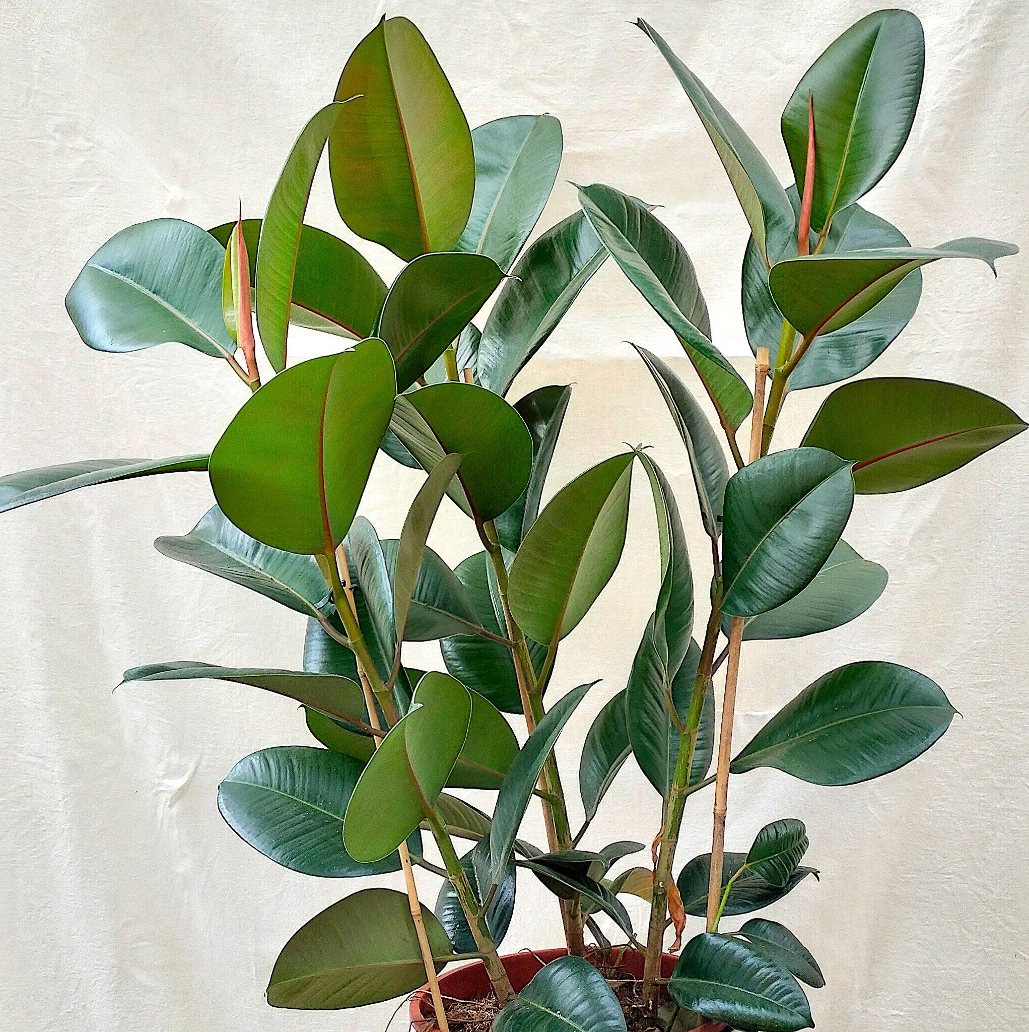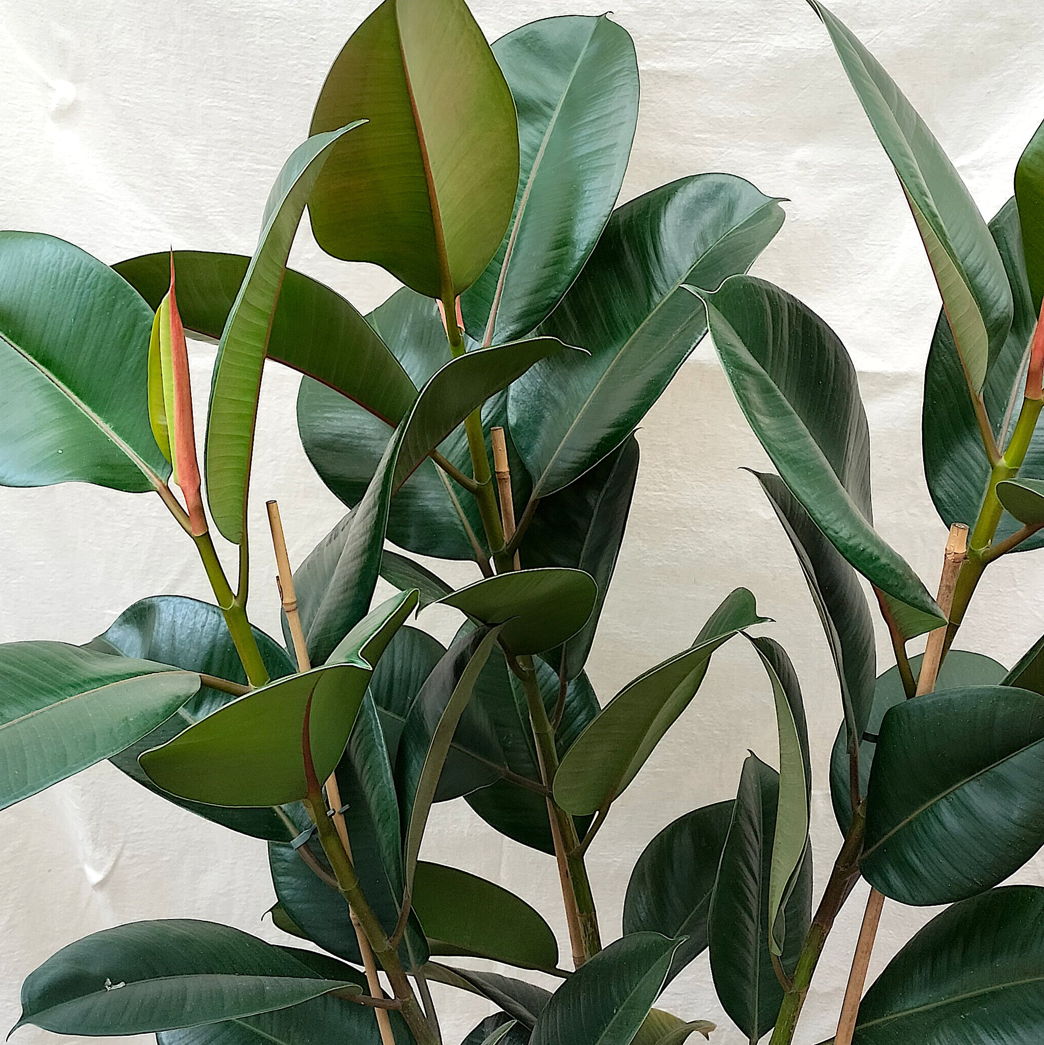 The Ficus elastica 'Robusta', commonly known as the Rubber Plant, is a classic, architectural houseplant prized for its massive, broad, and deeply glossy green leaves. This specific specimen features a triple-stem configuration, standing at an impressive 90cm tall to provide immediate, voluminous structural impact rather than a single, sparse trunk. As a highly resilient and adaptable indoor tree, it serves as an excellent, low-maintenance statement piece that brings substantial jungle-like height to modern living spaces and offices.